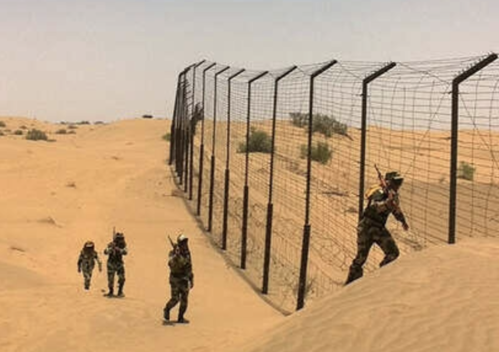 (India’s Border Security Force (BSF) personnel patrolling the India-Pakistan border in the Thar desert region)
